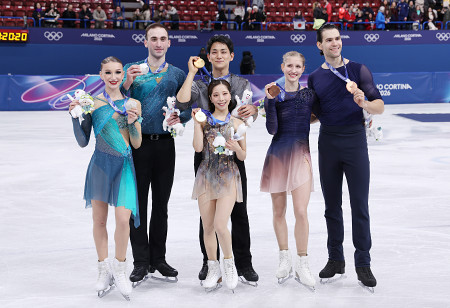 フィギュアスケートペアで金メダルを獲得した三浦璃来(中央手前)、木原龍一(同奥)組=16日、ミラノ郊外 【時事通信社】